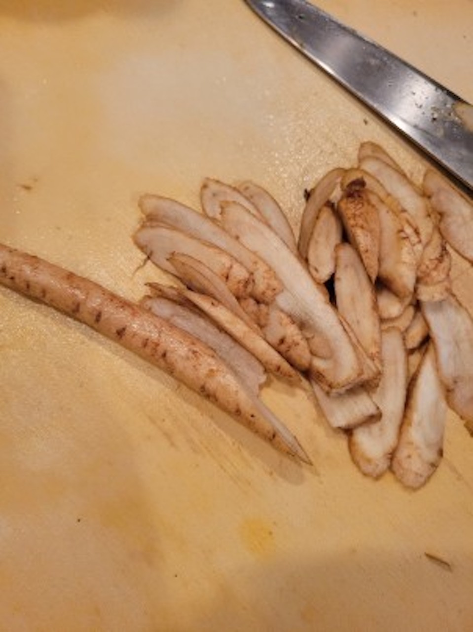 ①ゴボウを薄く斜めにスライス。