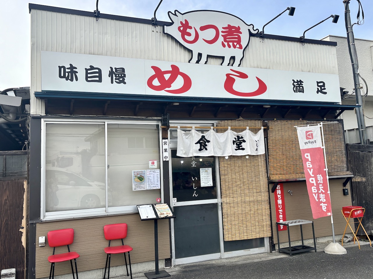 右手に、豚のシルエットに「もつ煮」と書かれた看板が見えてきます。