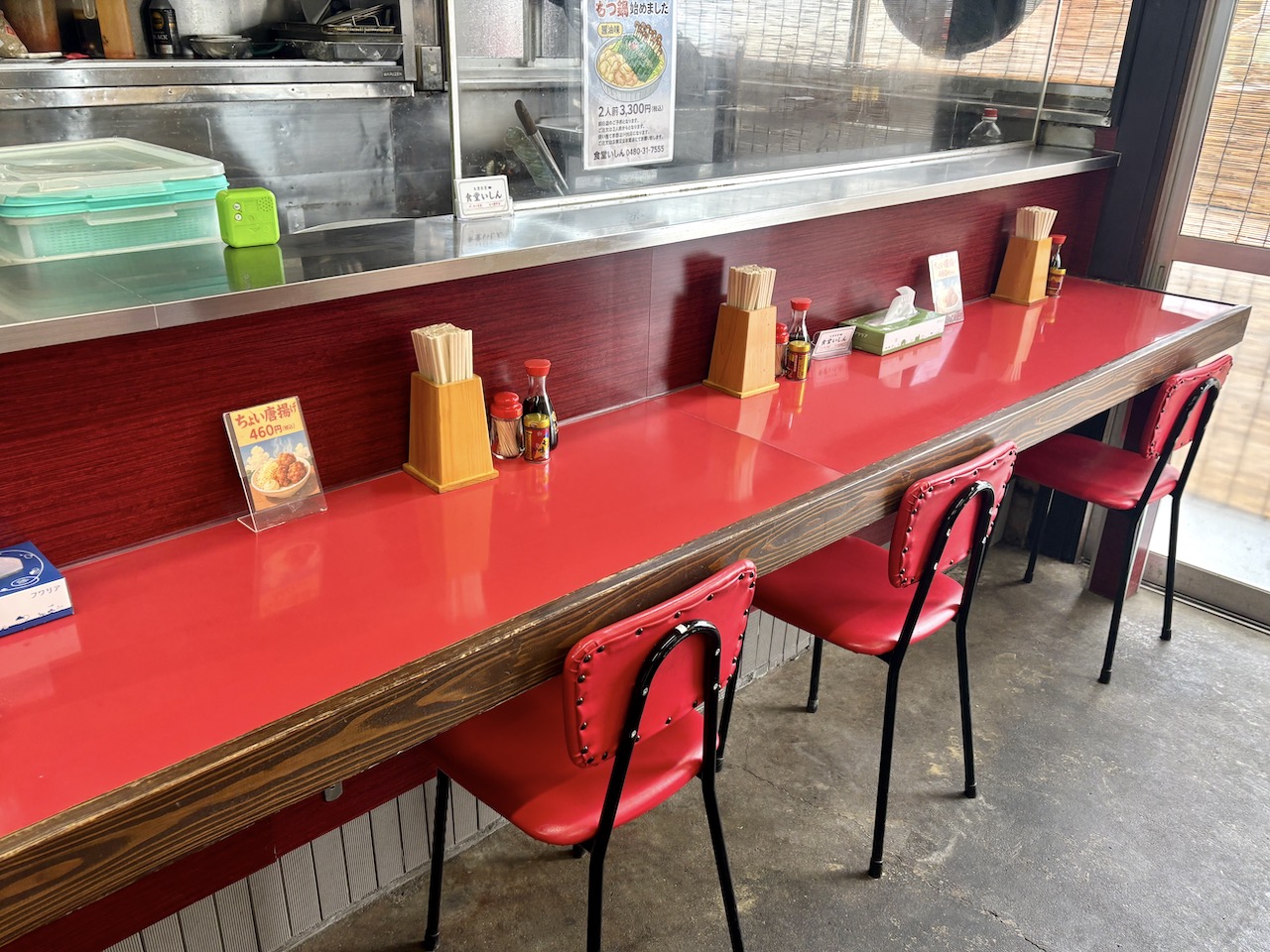 店内は、木のテーブルに、赤い椅子。
