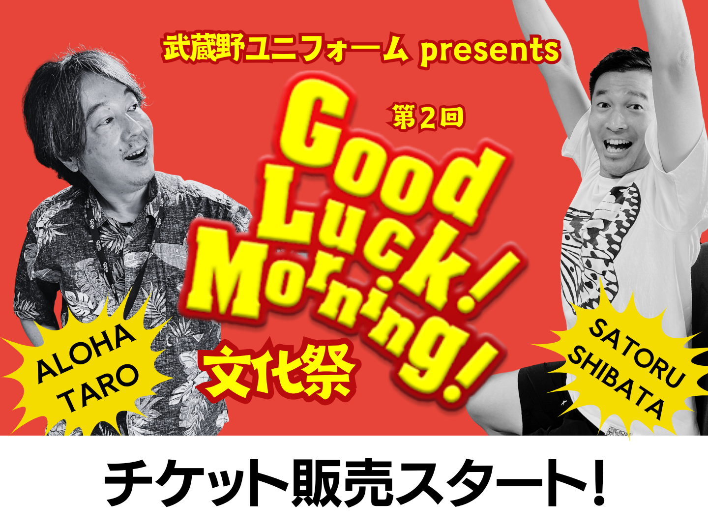 去年初開催し大好評を博した『Good Luck! Morning! 文化祭』が、パワーアップして帰ってきます。今年は『武蔵野ユニフォーム presents 第2回 Good Luck! Morning! 文化祭』として、2025年11月30日(日)彩の国さいたま芸術劇場・映像ホールで開催決定!番組を愛するリスナーの皆さんと一緒に盛り上がれる企画が盛りだくさん。笑いあり、挑戦あり、番組ならではの熱気を会場で体感してください。