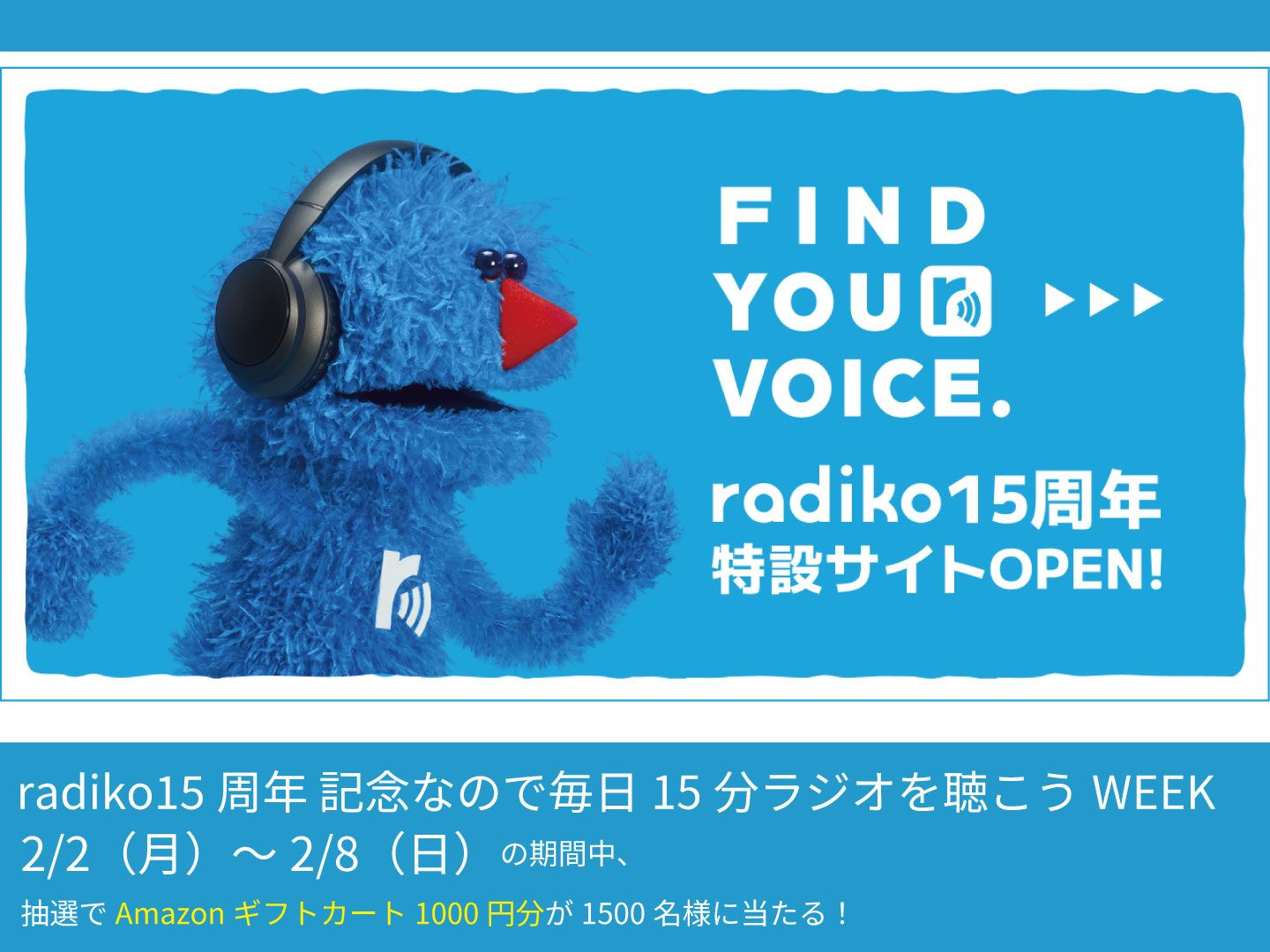 2月2日から2月8日までの1週間、毎日15分以上、radiko でラジオ番組またはポッドキャストを聴いてくれた方の中から、抽選で1,500名様にAmazon ギフトカード 1,000 円分をプレゼント。