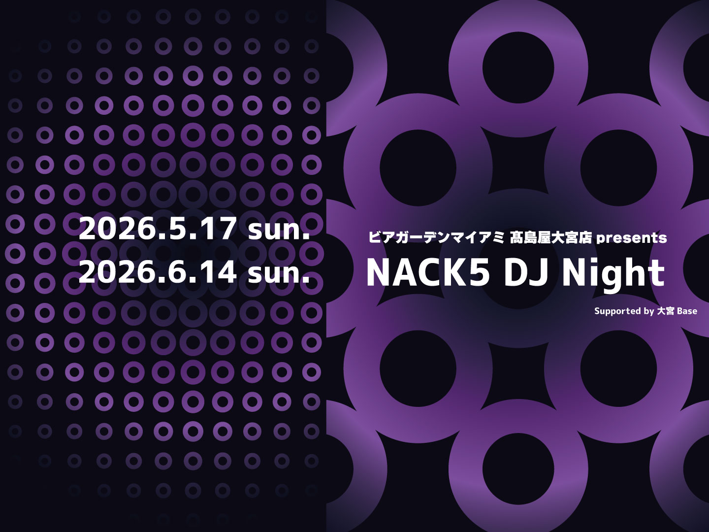 11種類のビール飲み放題、焼肉BBQ食べ放題!楽しく元気になれるビアガーデンマイアミ髙島屋大宮店で昨年秋に開催したNACK5のDJイベント『ビアガーデンマイアミ 髙島屋大宮店presents NACK5 DJ Night』が、今年は5月と6月に開催決定!美味しいお酒と料理に舌鼓を打ちながら、チームNACK5のDJコラボを楽しみませんか?
