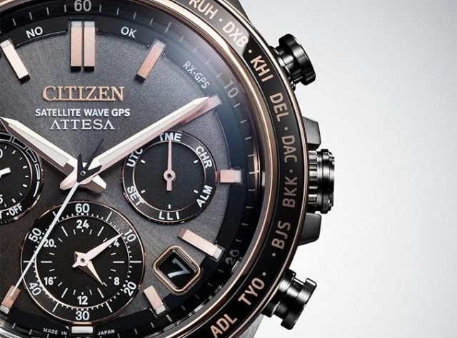 シチズンの技術を結集したフラッグシップモデル。GPS衛星電波受信機能を搭載し、世界中どこでも正確な時刻を刻む。黒とピンクゴールドのコントラストが美しく、スーツスタイルにも映える。サファイアガラスベゼルの上質な輝きが、特別な一本にふさわしい。