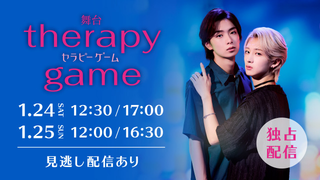 8人組ダンス&ボーカルグループ・MAZZELのNAOYAと7人組オルタナティブ歌謡舞踊集団・龍宮城の冨田侑暉がW主演を務める、日本テレビ系ドラマ『セラピーゲーム』の舞台版が、16日から25日にかけて、東京・日本青年館ホールで上演される。計4公演が、Huluにてライブ配信されることが7日、発表された。
