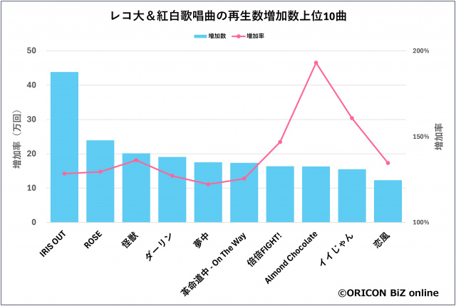 ■レコ大&紅白歌唱曲の再生数増加数上位10曲