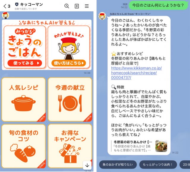サービスの特徴は、検索ワードを考える必要がない点だ。「ピーマンと豚バラがある」「今日は10分で作りたい」といった曖昧な相談にも、公式キャラクター「なあにちゃん」との会話形式で応じる。キッコーマンは、友人に相談するような感覚で献立を決められることを目指したという。
