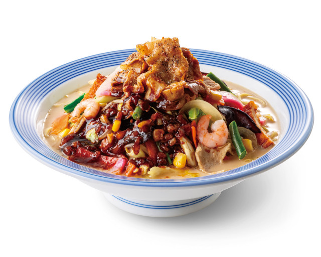 同店の代表的なメニュー『野菜たっぷりちゃんぽん』に禁断のアレンジを行った。パンチのきいた背脂にんにく醤油と豚しゃぶを豪快にのせた商品で、たっぷりの野菜はそのまま、背徳感を味わえる今までにない食べ応え抜群のメニュー。