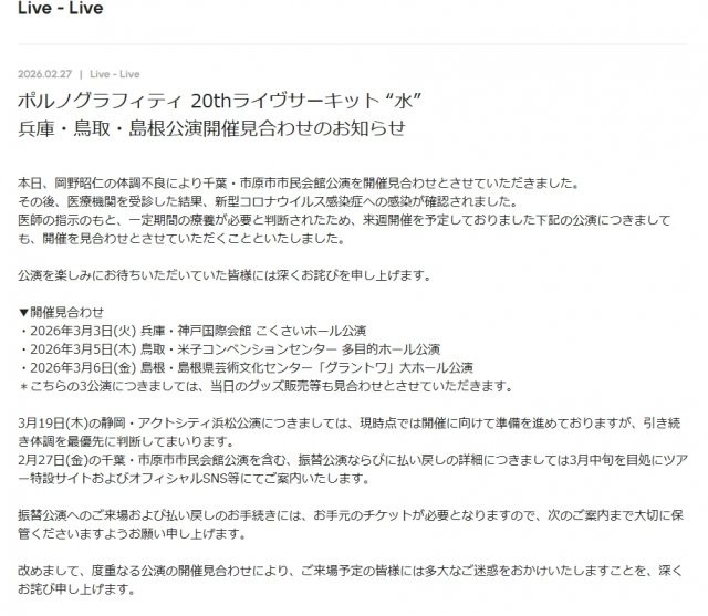 同グループは【ポルノグラフィティ 20thライヴサーキット “水”兵庫・鳥取・島根公演開催見合わせのお知らせ】と題した文書を発表。「本日、岡野昭仁の体調不良により千葉・市原市市民会館公演を開催見合わせとさせていただきました。その後、医療機関を受診した結果、新型コロナウイルス感染症への感染が確認されました」と理由を明かし、「医師の指示のもと、一定期間の療養が必要と判断されたため、来週開催を予定しておりました下記の公演につきましても、開催を見合わせとさせていただくことといたしました」「公演を楽しみにお待ちいただいていた皆様には深くお詫びを申し上げます」と謝罪した。