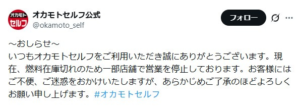 【画像】「燃料在庫切れのため一部店舗で営業を停止」オカモトセルフの投稿