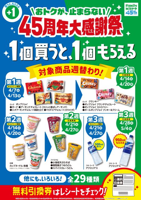 7日から27日まで、期間中、対象商品を1個買うと対象の商品と引き換えられる無料引換券(レシートクーポン)を1枚もらえる、春の「1個買うと、1個もらえる」キャンペーンを実施。