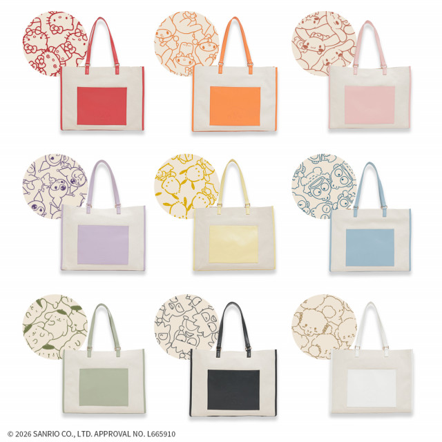 合皮のパイピングとキャラクターの型押しがアクセント。安心のファスナー開閉で、裏地はさまざまな表情×マイカラーのキュートな総柄。うちわやPCを収納できるクッション仕切りや便利なポケット付き。背面はキャリーケースのハンドルに通せるキャリーオン仕様で、取り付けたまま持ち運べて移動もラクちん。